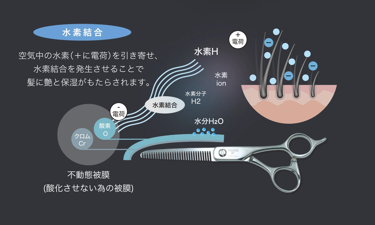 TOKIKATA(トキカタ)は、ハサミのような形をしていますが、髪を1本も切りません。薬剤も一切使わず、特殊なシザーコームで髪の根元を「梳かす」ことで、髪の悩みを根本から解決するまったく新しいヘアメニューです。